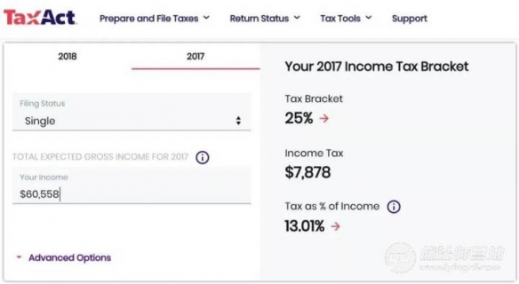 独身环境下税前支出60558美元在2017年的所得税计较,需交纳7878美元所得税