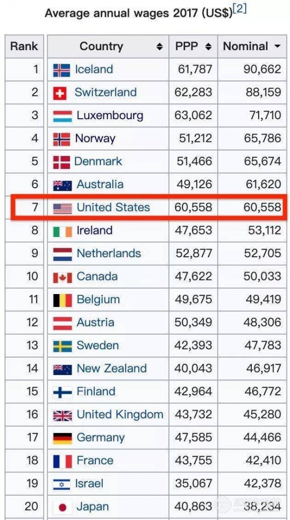 2017年环球人均年薪资排名