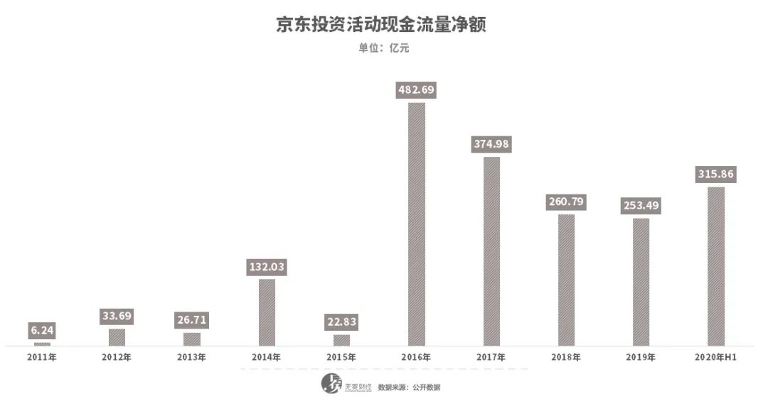 京东IPO前的2011-2013年,投资活动现金流出总额约67亿元;2014年后,京东每年投资总额基本维持在百亿元以上,2016年达到巅峰,约为483亿元。2020年上半年,京东投资净额为316亿元;全年有望再创历史新高。