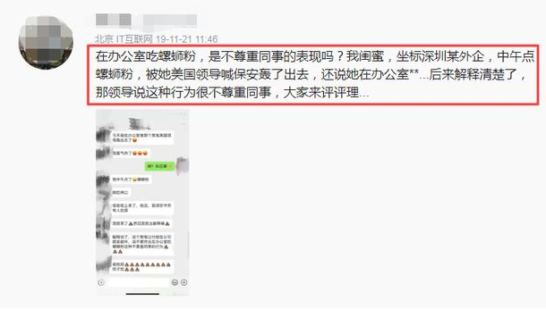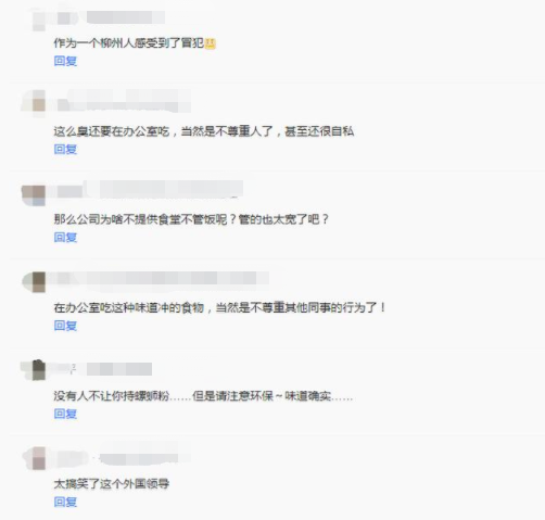 克日,在论坛上一名白领发帖吐槽,“在办公室吃螺蛳粉,是不恭敬共事的表现吗?我闺蜜在深圳某外企,午时点螺蛳粉,被她的美国带领喊保安轰了进来,还说她在办公室“吃屎”...后来表明明白了,那带领说如许的举动很不恭敬共事,大师来评评理。”什么?办公室吃螺蛳粉?引发了网友的围观与批评。