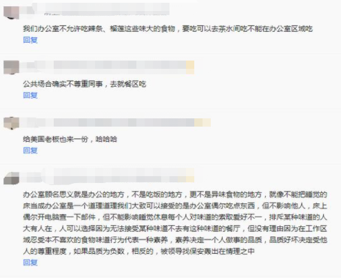 也有网友吐槽道,如果公司有访客的话,闻到如许的滋味会给公司拉分的,乃至会影响合作,螺蛳粉,臭豆腐,榴莲等口胃过重了,确切不得当在封锁的空间吃,不喜好的会对他发生讨厌感,让人受不了,对付如许的工具本身径自享用就行了,况且办公室望文生义便是办公之处,不是用饭之处,在办公室吃工具的共事,可长点心吧!